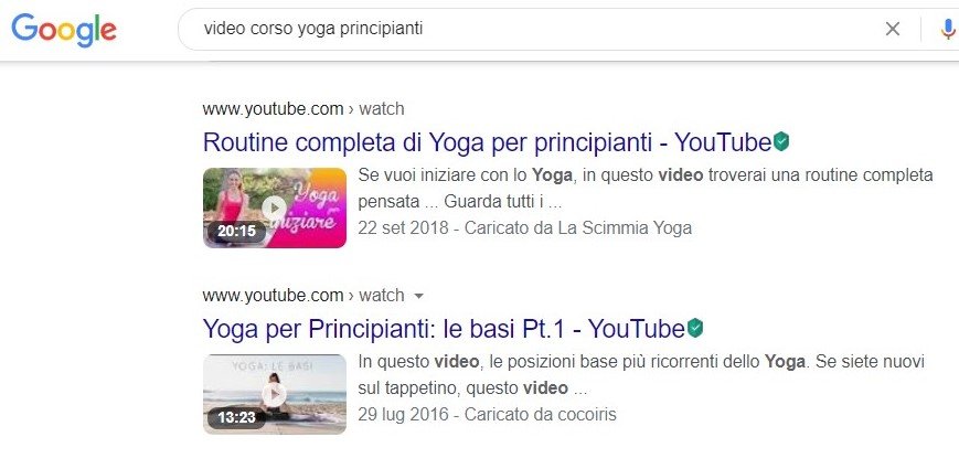 Vediamo un esempio concreto. Inizia con “videocorso yoga” e una volta che hai visto cosa c’è lì, potresti guardare più specificamente “Yoga per principianti”.